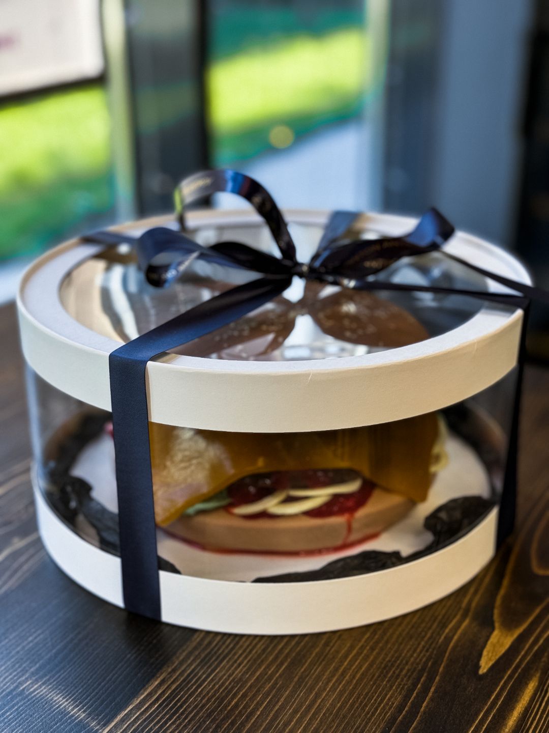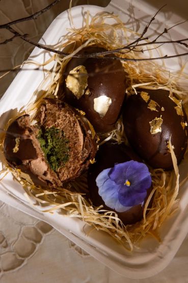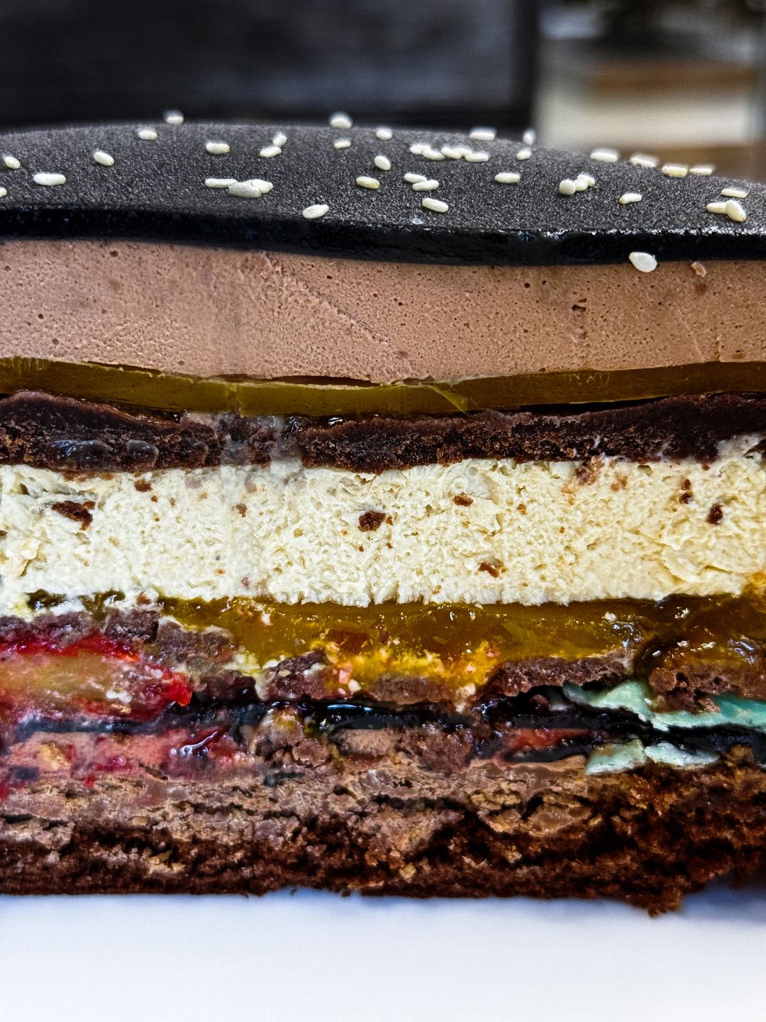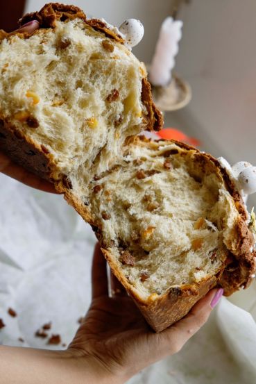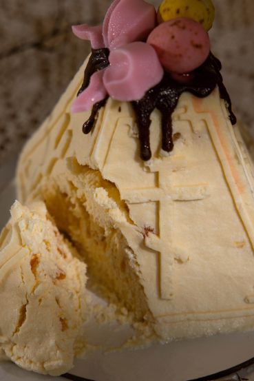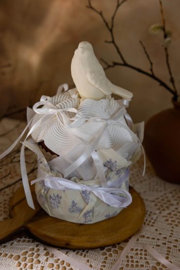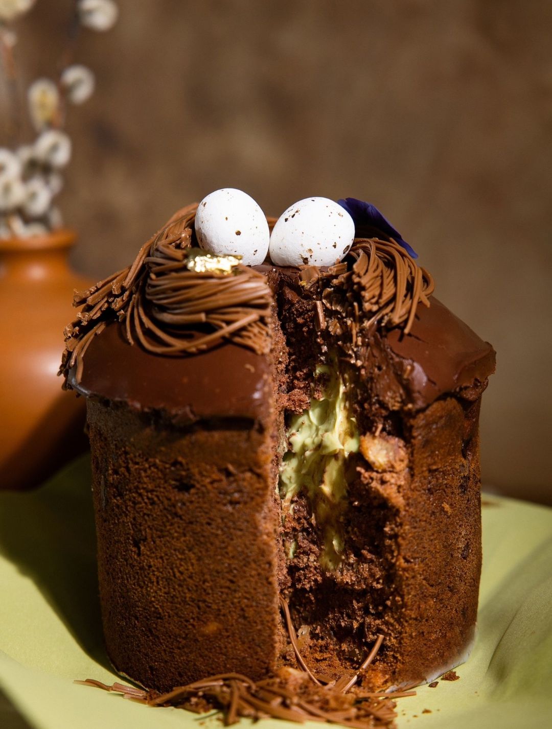 Бездрожжевой шоколадный кулич (кекс) с начинкой "Дубай" (фисташка/тесто Катаифи), наполнителем из орешков, капель бельгийского шоколада и клюквы.Внутри нежнейший фисташковый заварной крем. Шоколадная сладкая помадка с изысканным декором.